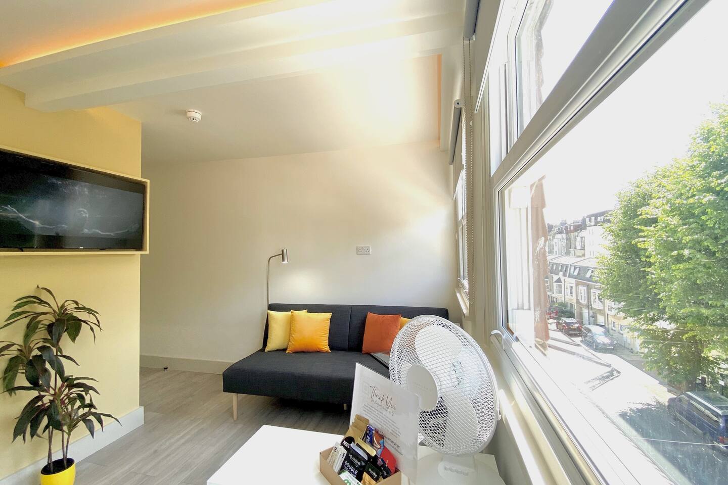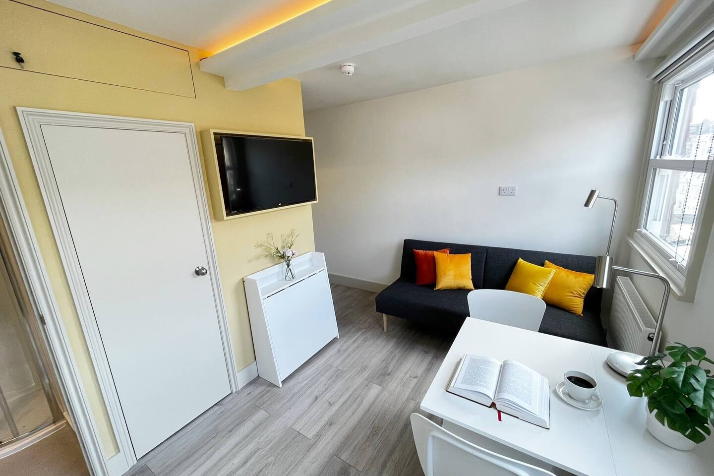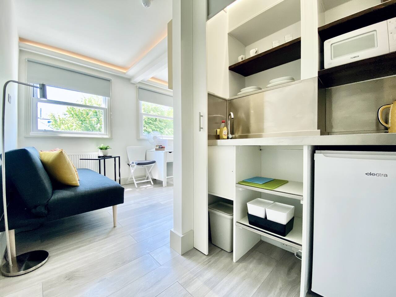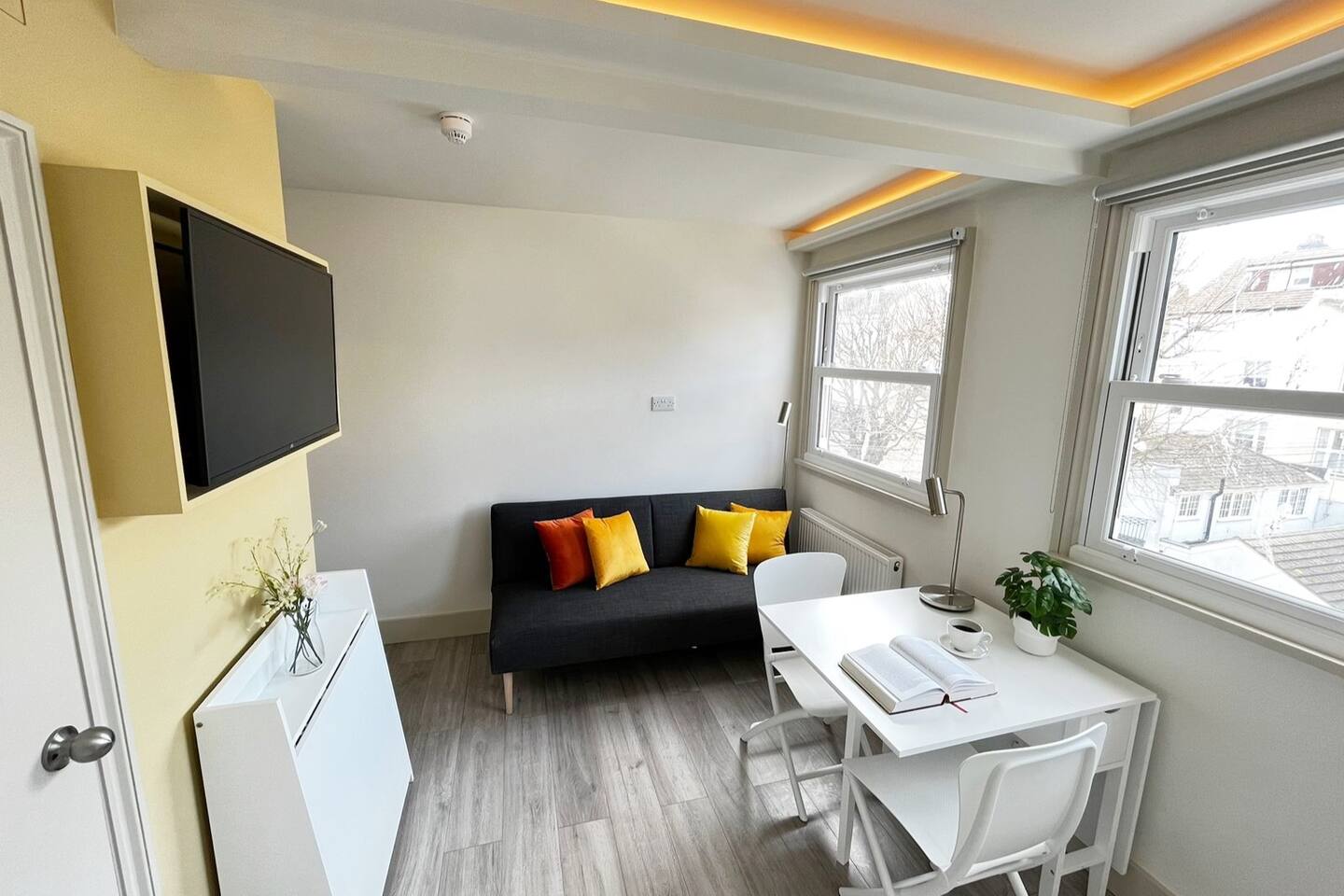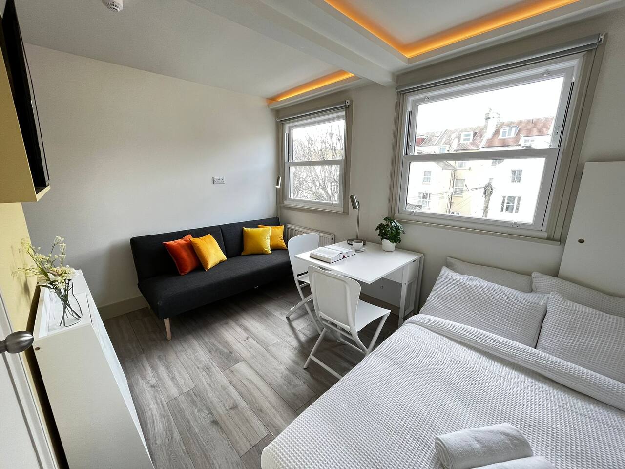 Make your way along the quiet street lined with beautiful Victorian townhouses and into your own modern (almost) beachside studio, filled with clever design, bright open spaces, and everything you could need for a comfortable stay. This thoughtfully designed studio overlooks the charming streets of Hove. Enjoy your morning coffee at the café-style table, then fold it away for more room to relax. The living area features a comfy sofa facing a wall-mounted smart TV with all your favorite streaming apps. The sofa also converts into a second sleeping space for an additional guest. Prepare light meals in the fully equipped kitchenette with a small fridge, microwave, dinnerware, utensils, and sink. For bigger meals, guests are welcome to use the optional larger gourmet kitchen and dining area within the building. The Murphy bed folds down effortlessly from the closet, ready with fresh linens for a comfortable night’s sleep. A cozy study nook with a desk, lamp, and shelving is perfect for working or studying. The bathroom is modern, sparkling clean, and features a shower enclosure and a vanity stocked with towels, hand wash, shampoo, conditioner, and body wash. Enjoy 24/7 access to the on-site laundry room, with complimentary detergent provided—perfect for longer stays or travelers packing light. All of this is located just steps from Hove’s beautiful beach, independent cafés, eclectic shops, and easy transport links into Brighton and beyond. Book your stay and experience relaxed, stylish living by the sea — we can’t wait to host you!