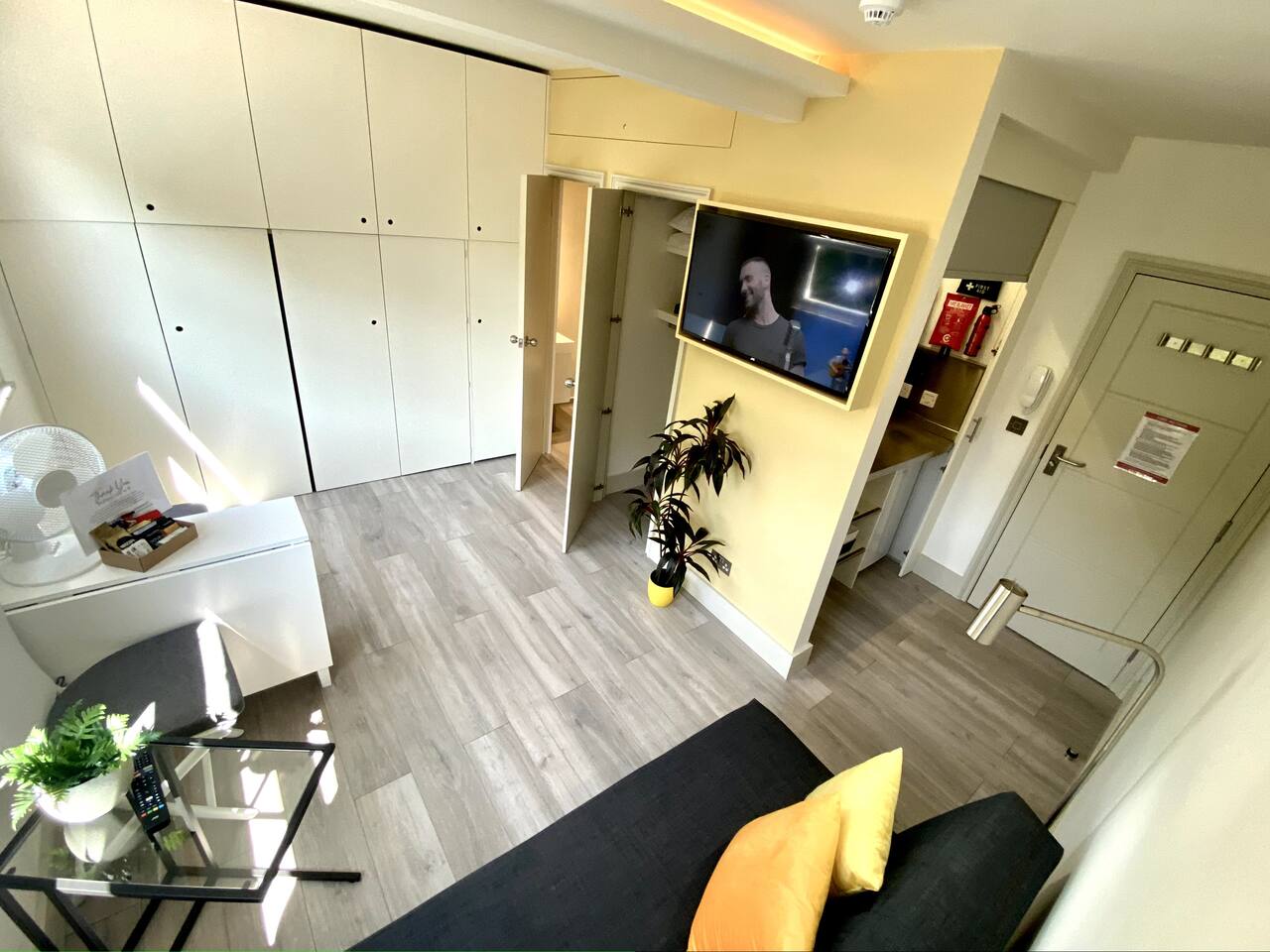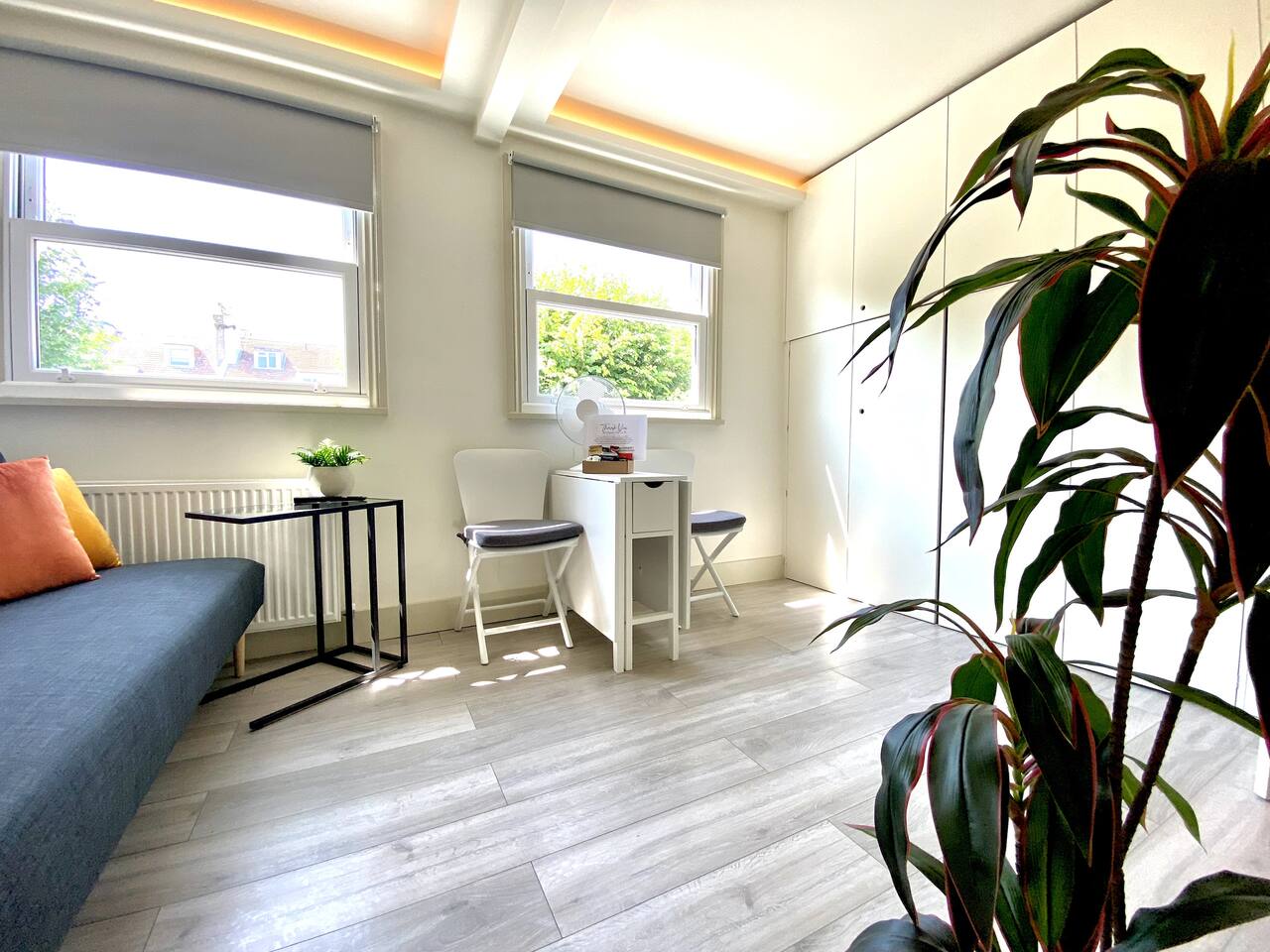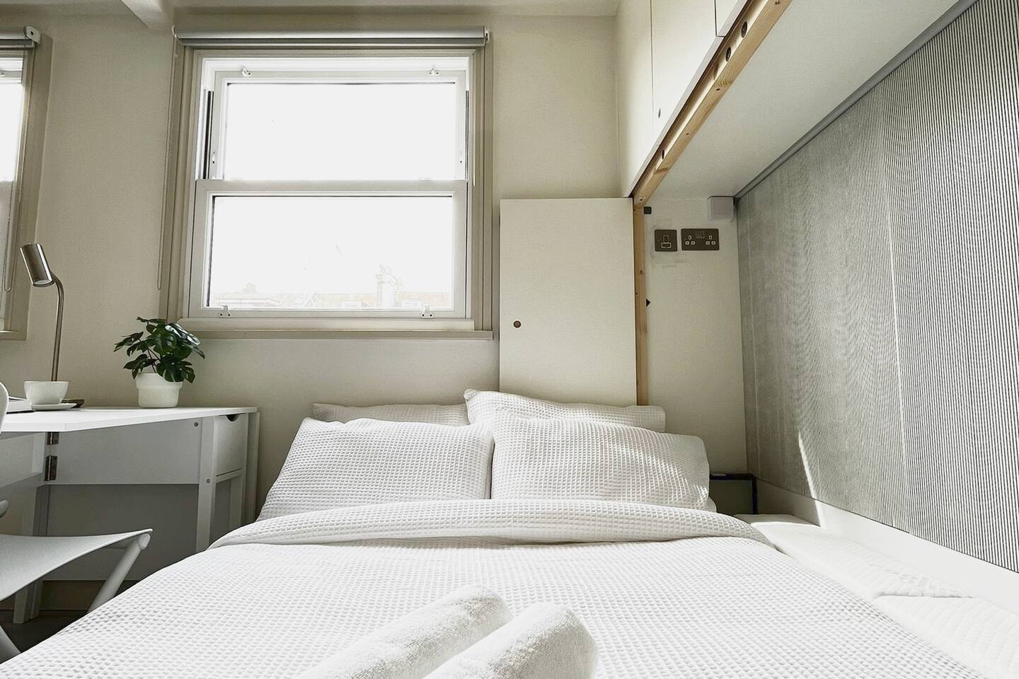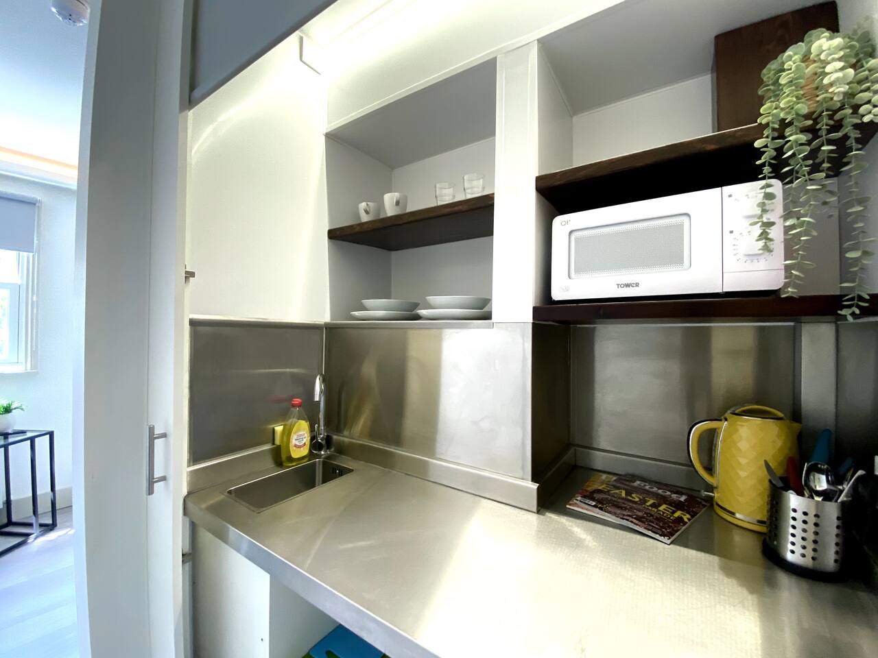 Make your way along the quiet street lined with beautiful Victorian townhouses and into your own modern (almost) beachside studio, filled with clever design, bright open spaces, and everything you could need for a comfortable stay. This thoughtfully designed studio overlooks the charming streets of Hove. Enjoy your morning coffee at the café-style table, then fold it away for more room to relax. The living area features a comfy sofa facing a wall-mounted smart TV with all your favorite streaming apps. The sofa also converts into a second sleeping space for an additional guest. Prepare light meals in the fully equipped kitchenette with a small fridge, microwave, dinnerware, utensils, and sink. For bigger meals, guests are welcome to use the optional larger gourmet kitchen and dining area within the building. The Murphy bed folds down effortlessly from the closet, ready with fresh linens for a comfortable night’s sleep. A cozy study nook with a desk, lamp, and shelving is perfect for working or studying. The bathroom is modern, sparkling clean, and features a shower enclosure and a vanity stocked with towels, hand wash, shampoo, conditioner, and body wash. Enjoy 24/7 access to the on-site laundry room, with complimentary detergent provided—perfect for longer stays or travelers packing light. All of this is located just steps from Hove’s beautiful beach, independent cafés, eclectic shops, and easy transport links into Brighton and beyond. Book your stay and experience relaxed, stylish living by the sea — we can’t wait to host you!