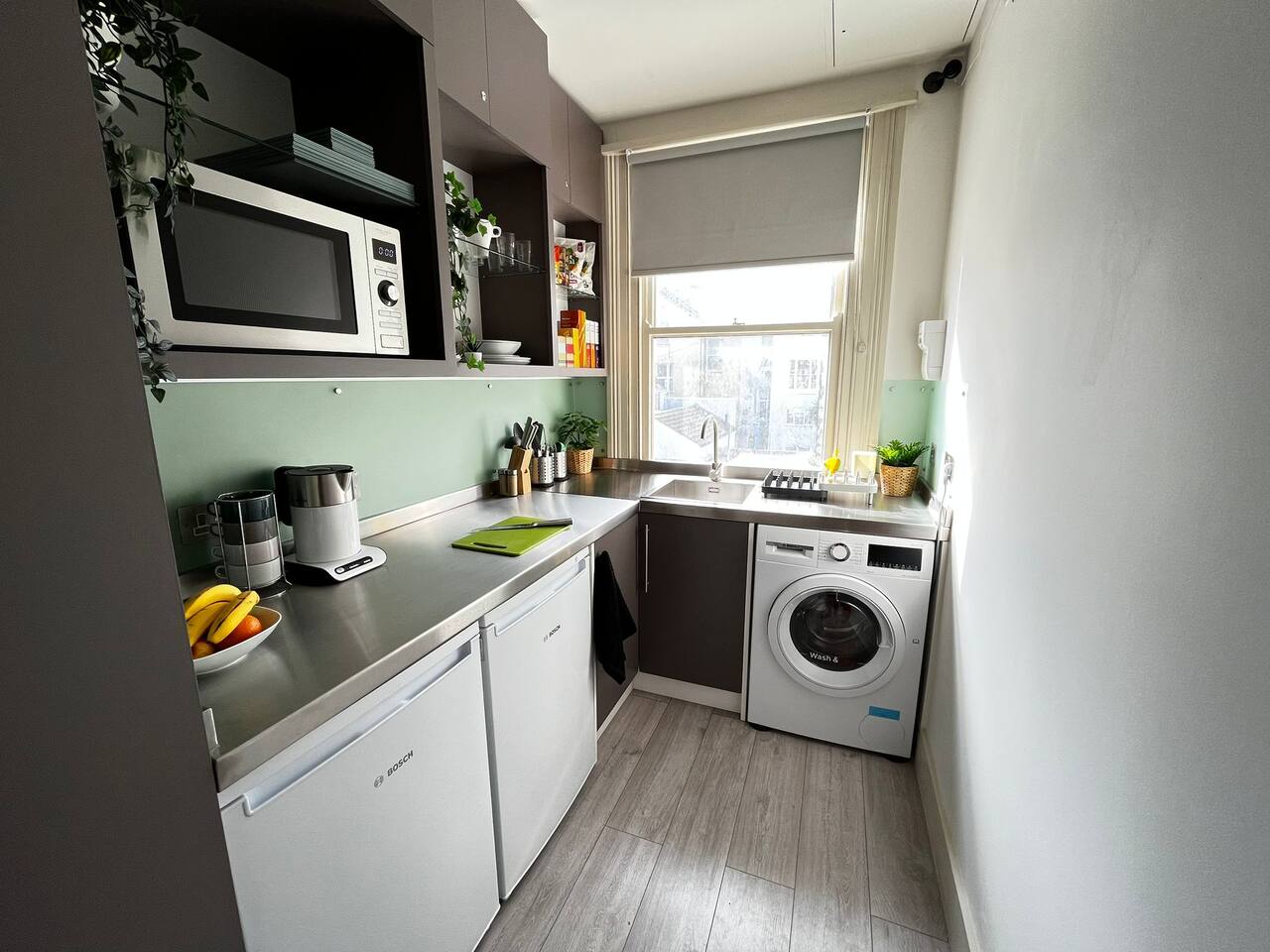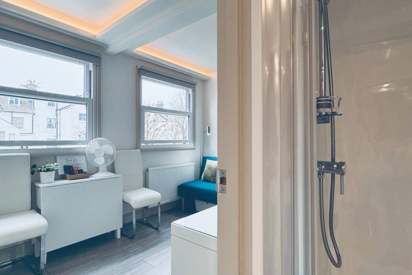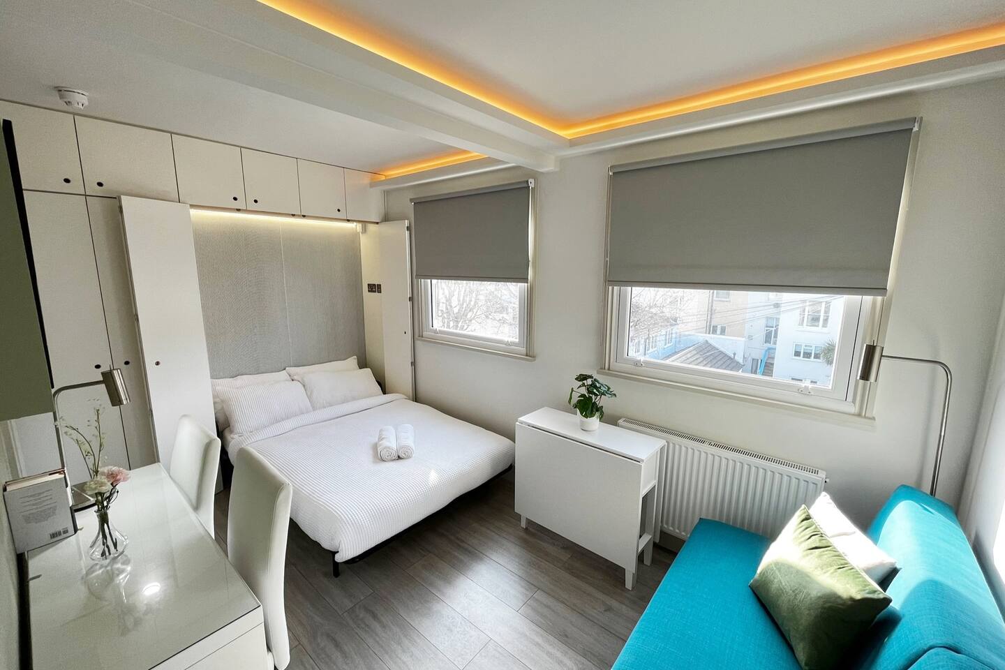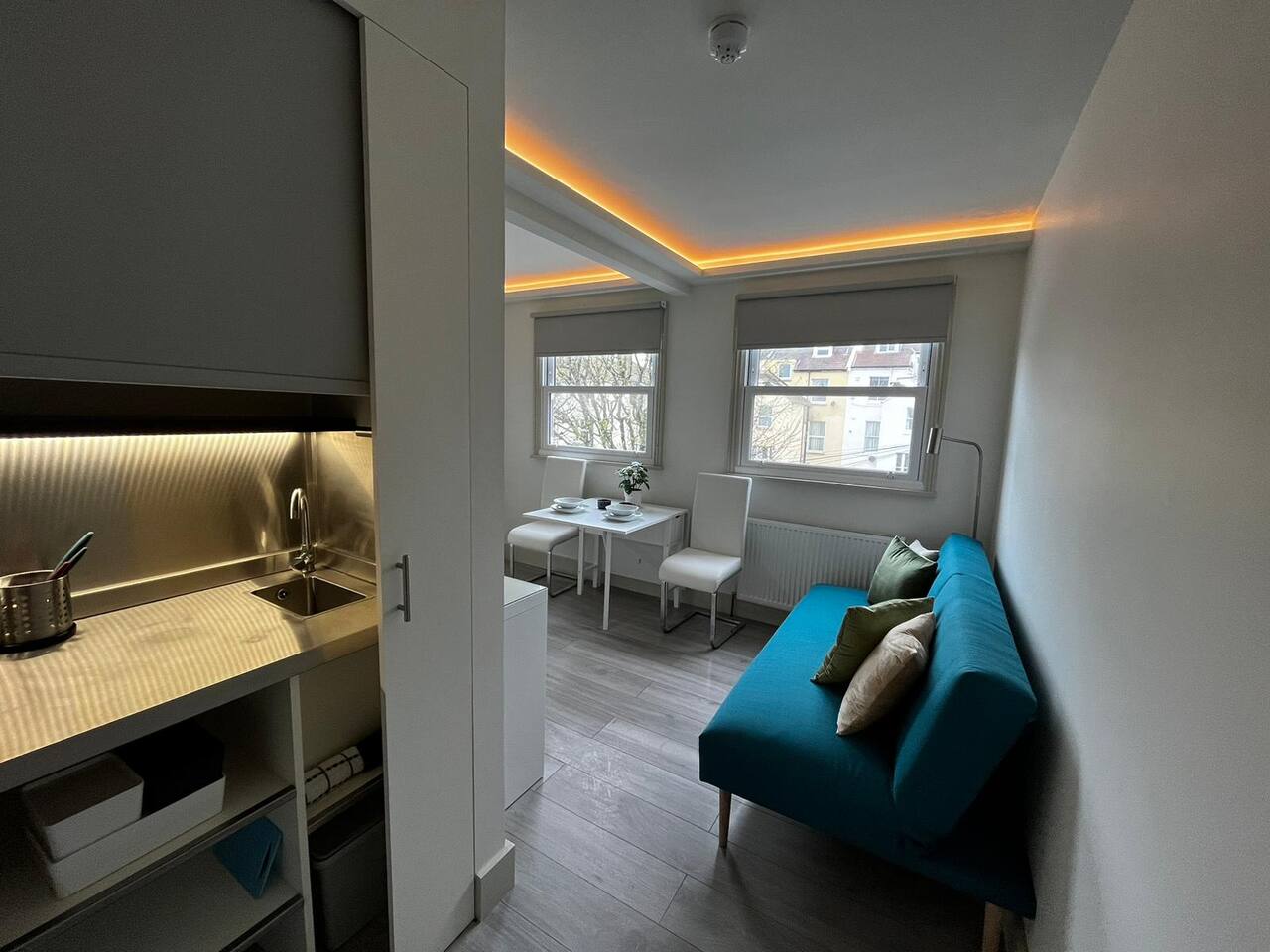Make your way along the quiet street lined with beautiful Victorian townhouses and into your own modern (almost) beachside studio, filled with clever design, bright open spaces, and everything you could need for a comfortable stay. This thoughtfully designed studio overlooks the charming streets of Hove. Enjoy your morning coffee at the café-style table, then fold it away for more room to relax. The living area features a comfy sofa facing a wall-mounted smart TV with all your favorite streaming apps. The sofa also converts into a second sleeping space for an additional guest. Prepare light meals in the fully equipped kitchenette with a small fridge, microwave, dinnerware, utensils, and sink. For bigger meals, guests are welcome to use the optional larger gourmet kitchen and dining area within the building. The Murphy bed folds down effortlessly from the closet, ready with fresh linens for a comfortable night’s sleep. A cozy study nook with a desk, lamp, and shelving is perfect for working or studying. The bathroom is modern, sparkling clean, and features a shower enclosure and a vanity stocked with towels, hand wash, shampoo, conditioner, and body wash. Enjoy 24/7 access to the on-site laundry room, with complimentary detergent provided—perfect for longer stays or travelers packing light. All of this is located just steps from Hove’s beautiful beach, independent cafés, eclectic shops, and easy transport links into Brighton and beyond. Book your stay and experience relaxed, stylish living by the sea — we can’t wait to host you!