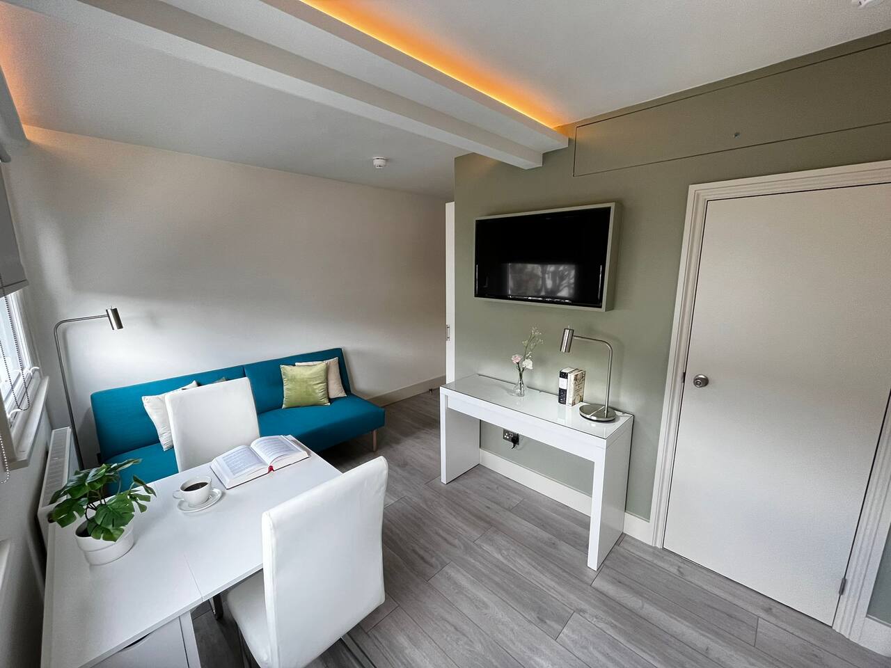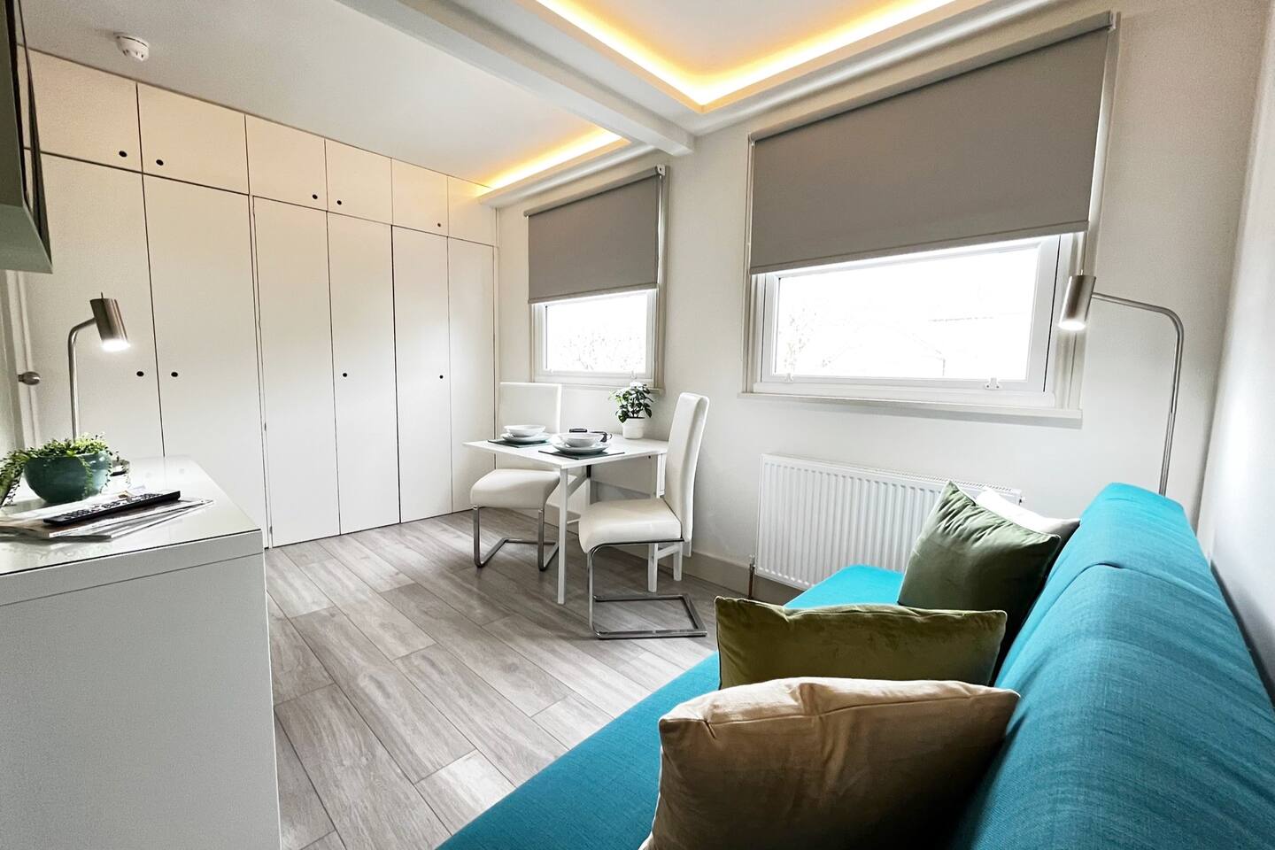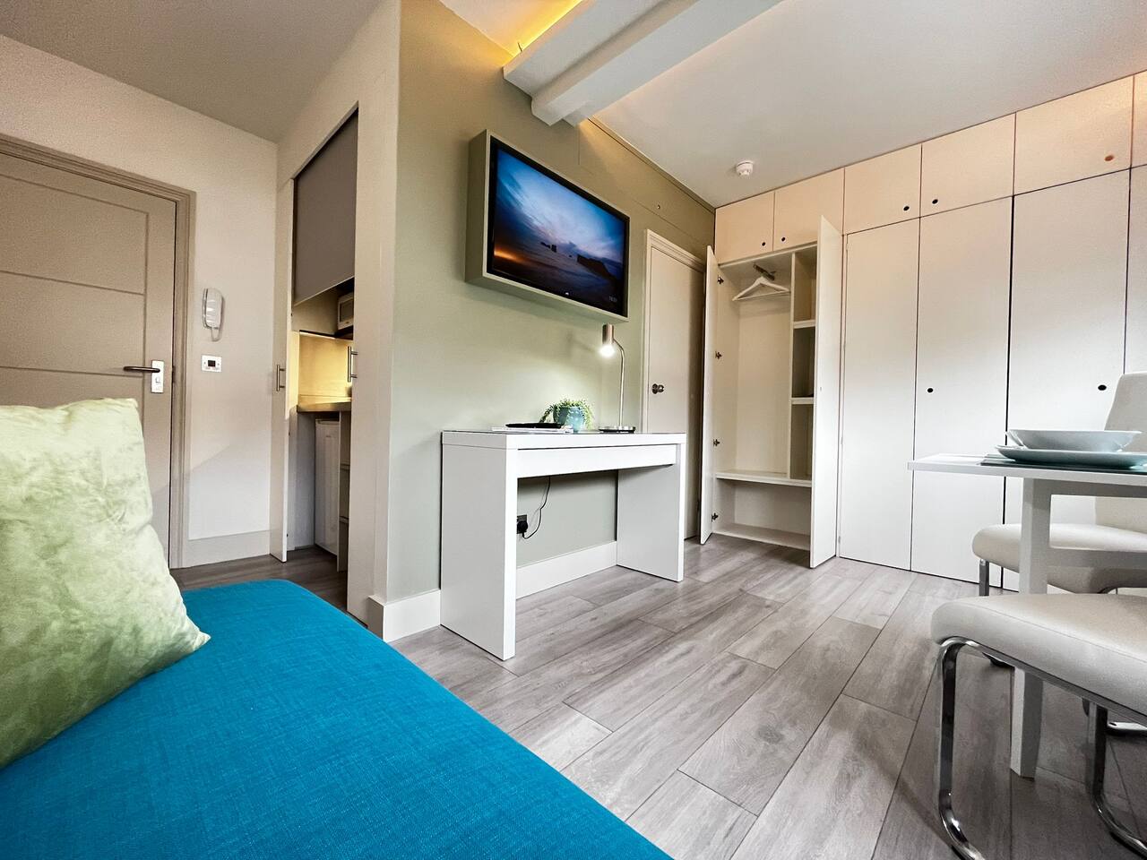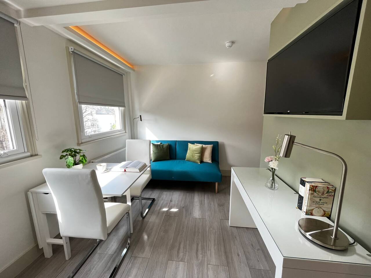 Make your way along the quiet street lined with beautiful Victorian townhouses and into your own modern (almost) beachside studio, filled with clever design, bright open spaces, and everything you could need for a comfortable stay. This thoughtfully designed studio overlooks the charming streets of Hove. Enjoy your morning coffee at the café-style table, then fold it away for more room to relax. The living area features a comfy sofa facing a wall-mounted smart TV with all your favorite streaming apps. The sofa also converts into a second sleeping space for an additional guest. Prepare light meals in the fully equipped kitchenette with a small fridge, microwave, dinnerware, utensils, and sink. For bigger meals, guests are welcome to use the optional larger gourmet kitchen and dining area within the building. The Murphy bed folds down effortlessly from the closet, ready with fresh linens for a comfortable night’s sleep. A cozy study nook with a desk, lamp, and shelving is perfect for working or studying. The bathroom is modern, sparkling clean, and features a shower enclosure and a vanity stocked with towels, hand wash, shampoo, conditioner, and body wash. Enjoy 24/7 access to the on-site laundry room, with complimentary detergent provided—perfect for longer stays or travelers packing light. All of this is located just steps from Hove’s beautiful beach, independent cafés, eclectic shops, and easy transport links into Brighton and beyond. Book your stay and experience relaxed, stylish living by the sea — we can’t wait to host you!