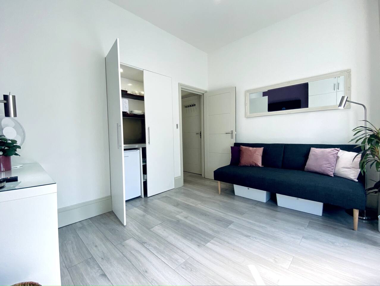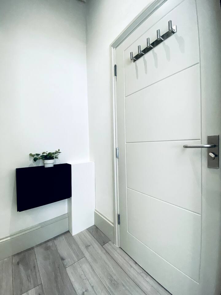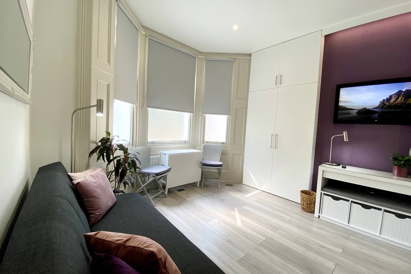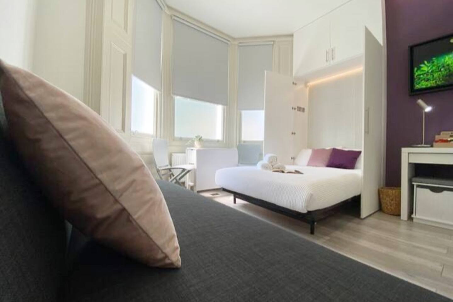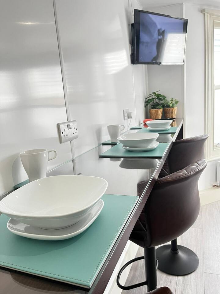 Make your way along the quiet street lined with beautiful Victorian townhouses and into your own modern (almost) beachside studio, filled with clever design, bright open spaces, and everything you could need for a comfortable stay. This thoughtfully designed studio overlooks the charming streets of Hove. Enjoy your morning coffee at the café-style table, then fold it away for more room to relax. The living area features a comfy sofa facing a wall-mounted smart TV with all your favorite streaming apps. The sofa also converts into a second sleeping space for an additional guest. Prepare light meals in the fully equipped kitchenette with a small fridge, microwave, dinnerware, utensils, and sink. For bigger meals, guests are welcome to use the optional larger gourmet kitchen and dining area within the building. The Murphy bed folds down effortlessly from the closet, ready with fresh linens for a comfortable night’s sleep. A cozy study nook with a desk, lamp, and shelving is perfect for working or studying. The bathroom is modern, sparkling clean, and features a shower enclosure and a vanity stocked with towels, hand wash, shampoo, conditioner, and body wash. Enjoy 24/7 access to the on-site laundry room, with complimentary detergent provided—perfect for longer stays or travelers packing light. All of this is located just steps from Hove’s beautiful beach, independent cafés, eclectic shops, and easy transport links into Brighton and beyond. Book your stay and experience relaxed, stylish living by the sea — we can’t wait to host you!