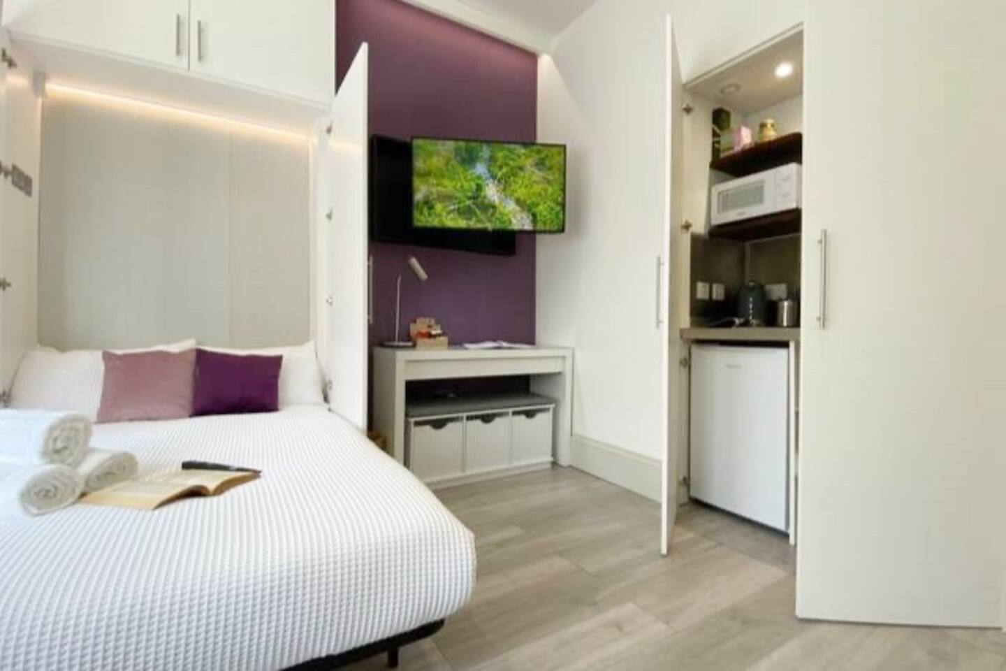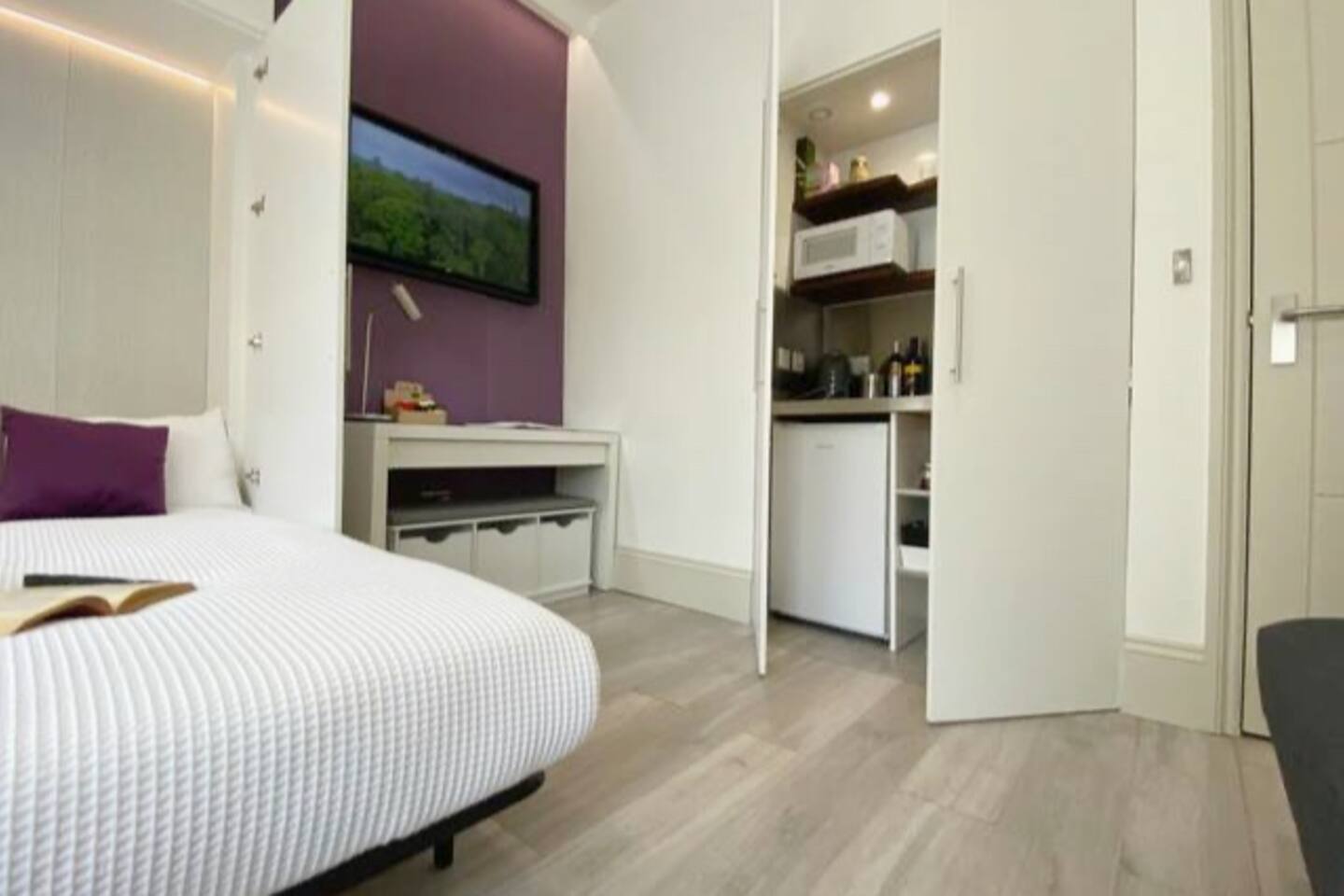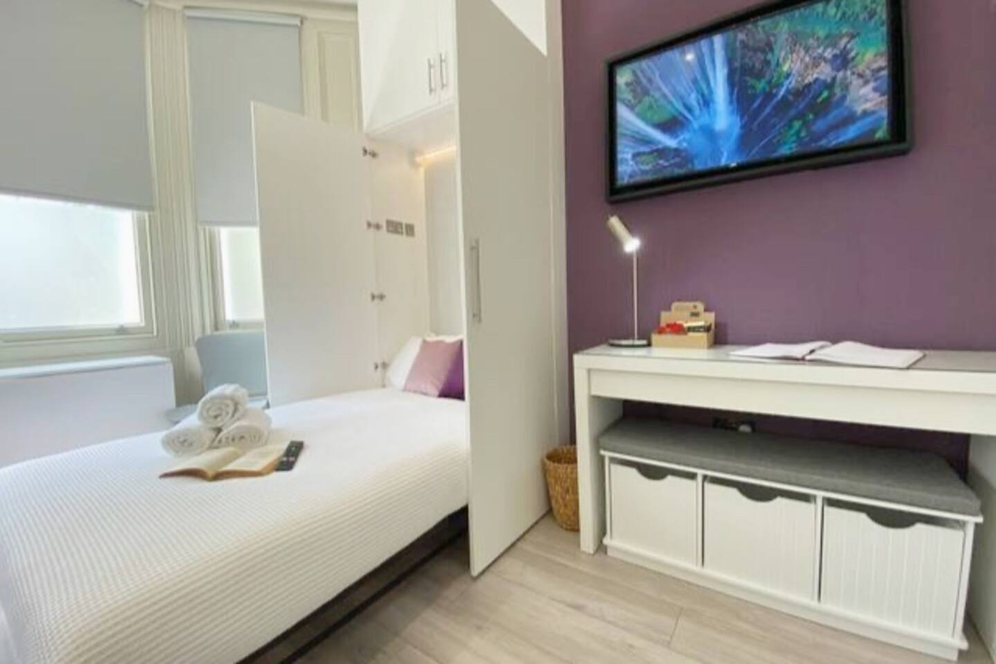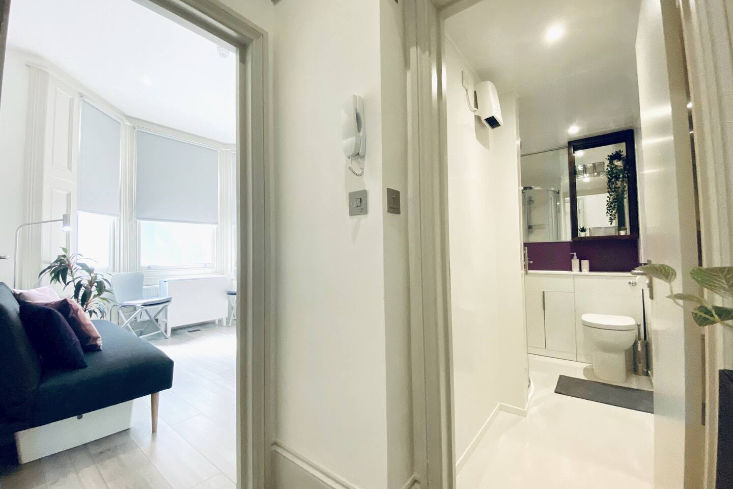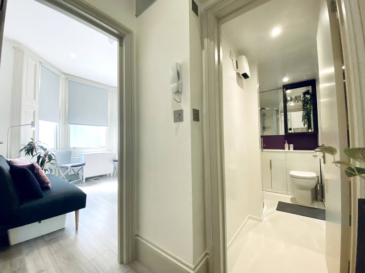 Make your way along the quiet street lined with beautiful Victorian townhouses and into your own modern (almost) beachside studio, filled with clever design, bright open spaces, and everything you could need for a comfortable stay. This thoughtfully designed studio overlooks the charming streets of Hove. Enjoy your morning coffee at the café-style table, then fold it away for more room to relax. The living area features a comfy sofa facing a wall-mounted smart TV with all your favorite streaming apps. The sofa also converts into a second sleeping space for an additional guest. Prepare light meals in the fully equipped kitchenette with a small fridge, microwave, dinnerware, utensils, and sink. For bigger meals, guests are welcome to use the optional larger gourmet kitchen and dining area within the building. The Murphy bed folds down effortlessly from the closet, ready with fresh linens for a comfortable night’s sleep. A cozy study nook with a desk, lamp, and shelving is perfect for working or studying. The bathroom is modern, sparkling clean, and features a shower enclosure and a vanity stocked with towels, hand wash, shampoo, conditioner, and body wash. Enjoy 24/7 access to the on-site laundry room, with complimentary detergent provided—perfect for longer stays or travelers packing light. All of this is located just steps from Hove’s beautiful beach, independent cafés, eclectic shops, and easy transport links into Brighton and beyond. Book your stay and experience relaxed, stylish living by the sea — we can’t wait to host you!