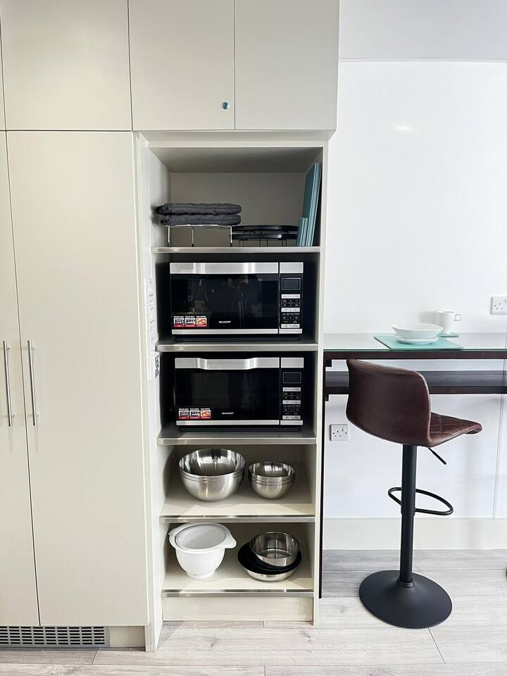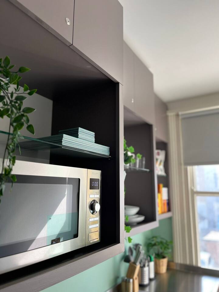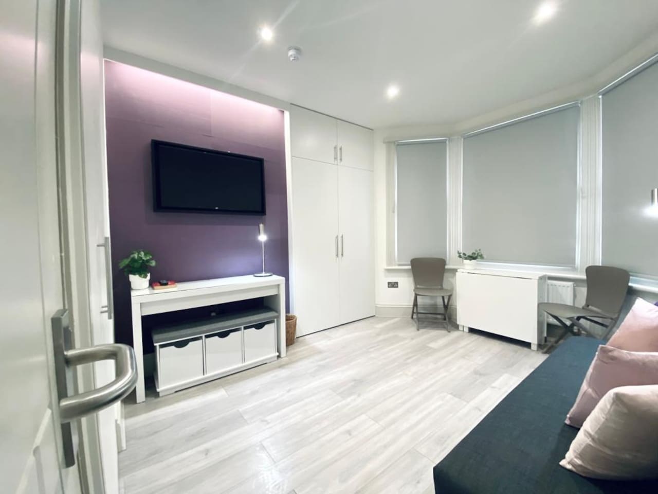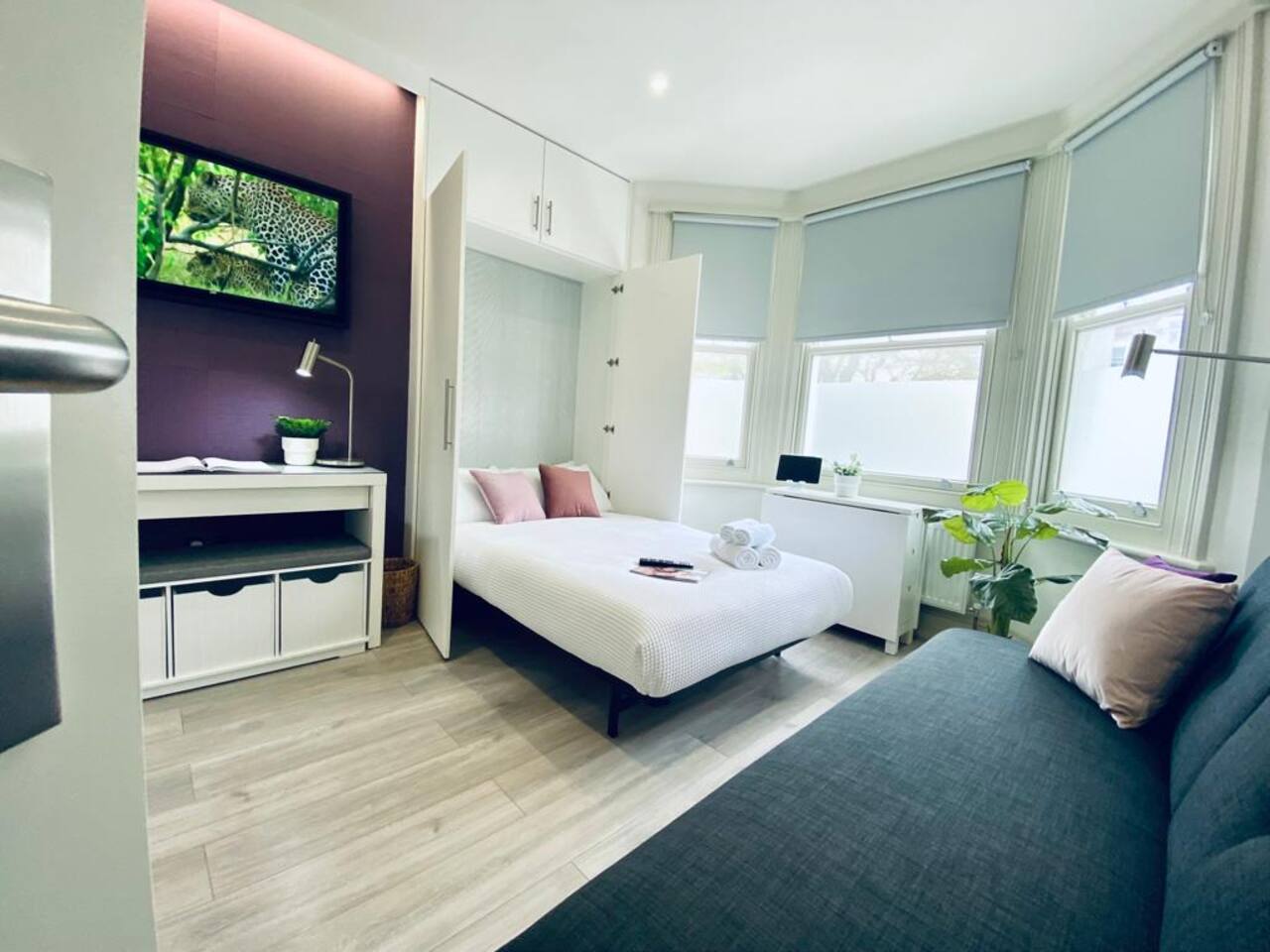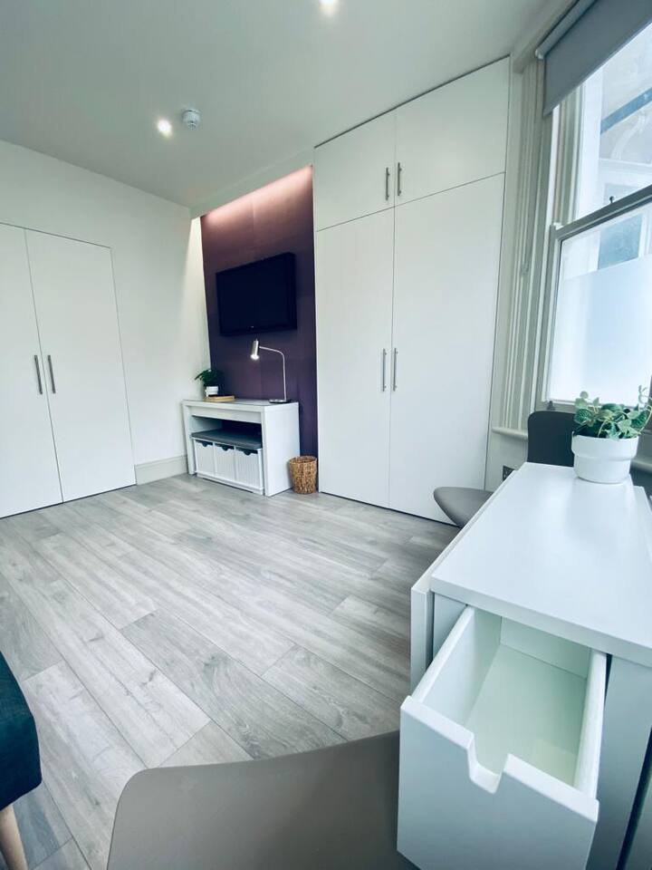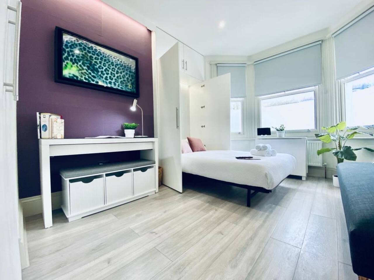 Make your way along the quiet street lined with beautiful Victorian townhouses and into your own modern (almost) beachside studio, filled with clever design, bright open spaces, and everything you could need for a comfortable stay. This thoughtfully designed studio overlooks the charming streets of Hove. Enjoy your morning coffee at the café-style table, then fold it away for more room to relax. The living area features a comfy sofa facing a wall-mounted smart TV with all your favorite streaming apps. The sofa also converts into a second sleeping space for an additional guest. Prepare light meals in the fully equipped kitchenette with a small fridge, microwave, dinnerware, utensils, and sink. For bigger meals, guests are welcome to use the optional larger gourmet kitchen and dining area within the building. The Murphy bed folds down effortlessly from the closet, ready with fresh linens for a comfortable night’s sleep. A cozy study nook with a desk, lamp, and shelving is perfect for working or studying. The bathroom is modern, sparkling clean, and features a shower enclosure and a vanity stocked with towels, hand wash, shampoo, conditioner, and body wash. Enjoy 24/7 access to the on-site laundry room, with complimentary detergent provided—perfect for longer stays or travelers packing light. All of this is located just steps from Hove’s beautiful beach, independent cafés, eclectic shops, and easy transport links into Brighton and beyond. Book your stay and experience relaxed, stylish living by the sea — we can’t wait to host you!